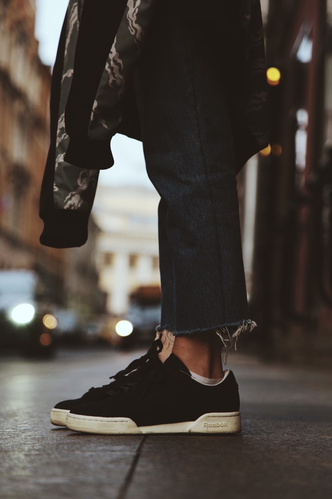 Первый образ я собирала исключительно из своих предпочтений, а именно : mom-джинсы на высокой талии, даже не смогу сейчас точно сказать бренд, милая черная кофта с открытыми плечами, кроссовки Reebok и бомбер Bat Norton. Это капсульная коллекция, содержащая в себе вещи трёх разных принтов. Я выбрала именно этот, так как мне очень близка тема Азии, а данный бомбер, как раз-таки, имеет элементы восточного стиля.